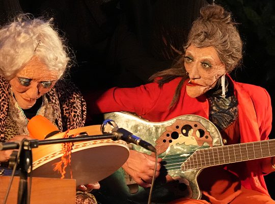 Un personnage de l’ombre tire les fils de l’histoire, une musicienne nous enveloppe des sons d’un étrange orgue à bouche tandis qu’un homme et une femme risquent à tout moment de passer au travers du plateau en tentant vainement de se rejoindre. Tout chute et s’écroule dans un éternel et impressionnant recommencement.
