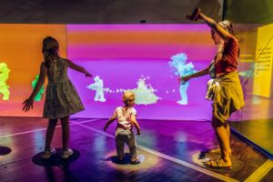 Quel que soit votre âge, ne manquez pas l’exposition immersive très réussie de la Cité des sciences : un espace étonnant au premier abord, composé de modules variés – les uns avec des parois opaques, les autres avec des parois translucides. Dans les derniers, on s’assoit et on contemple des extraits de films, ballets, dessins animés, publicités, qui illustrent à leur manière la thématique annoncée : « Tourner », « Sauter », « Marcher ».